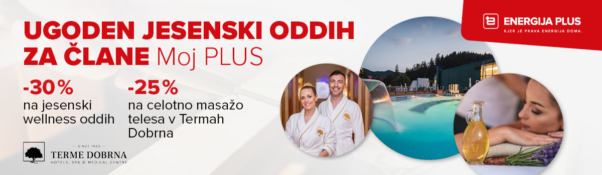 - 25% popust na ceno 50-minutne celotne masaže telesa (cena s popustom: 41,25 Eur, redna cena 55 EUR) v Termah Dobrna za vse člane lojalnostnega programa Moj PLUS.