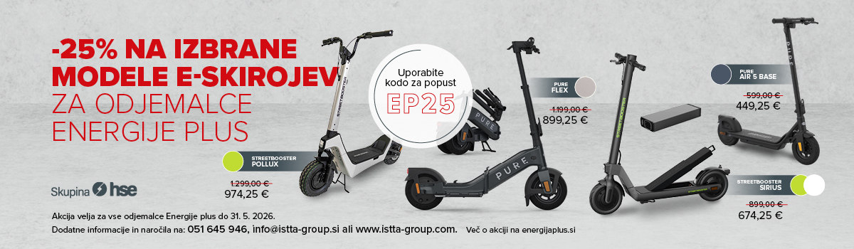 25% popust pri spletnem nakupu e-skirojev blagovne znamke Streetbooster in Pure s kodo EP25 na spletni strani www.istta-group.si samo za odjemalce Energije plus.