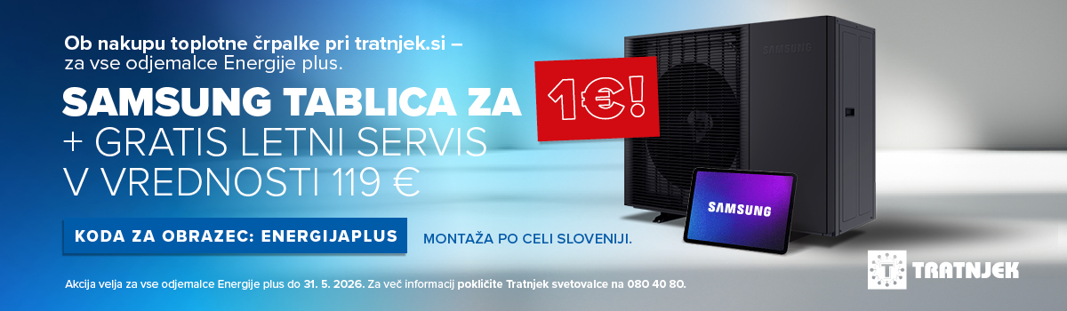 Ob nakupu toplotne črpalke na tratnjek.si Samsung tablica za 1 EUR in gratis letni servis v vrednosti 119 EUR.